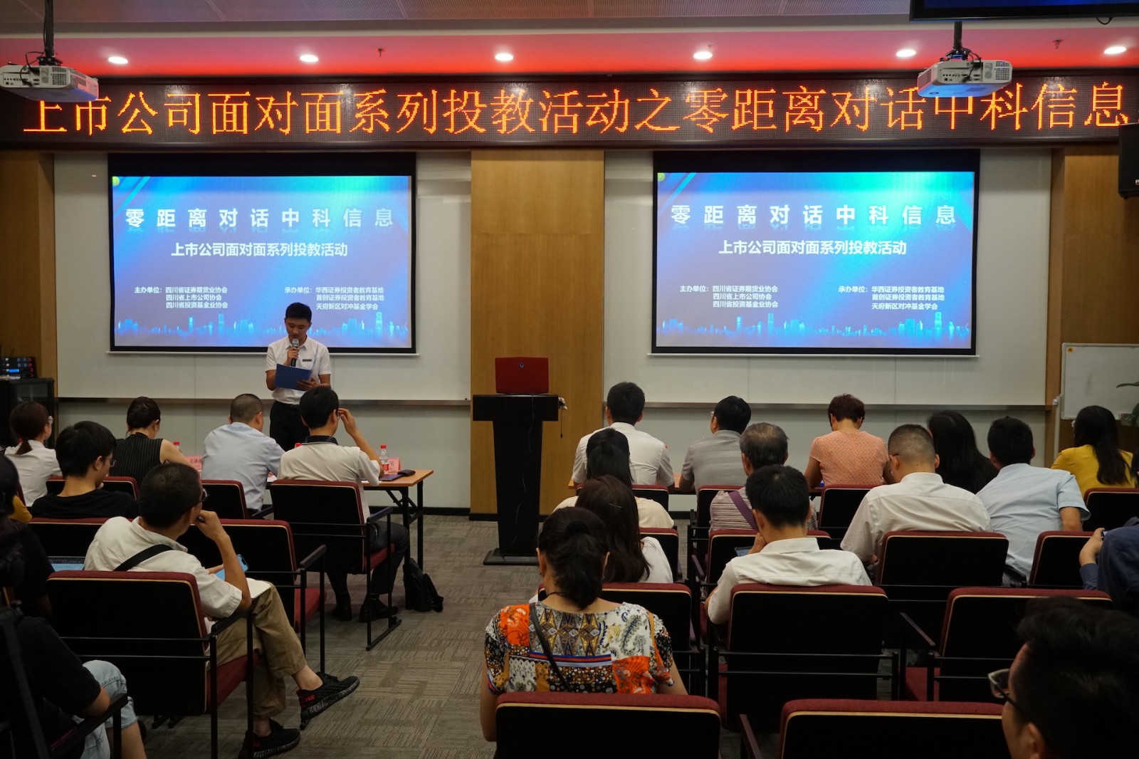 8月28日下午, 中科信息 (證券代碼:300678)參加了由四川省證券期貨業(yè)協(xié)會(huì)、四川省上市公司協(xié)會(huì)、四川投資基金業(yè)協(xié)會(huì)主辦的上市公司面對(duì)面系列投資者教育活動(dòng)。此次活動(dòng)主題為“零距離對(duì)話(huà)中科信息”,中科信息董事會(huì)秘書(shū)尹邦明、財(cái)務(wù)總監(jiān)劉小兵、四川省上市公司協(xié)會(huì)會(huì)員部副主任黃慶華及四川省內(nèi)部分機(jī)構(gòu)及個(gè)人投資者100余人參與了本次活動(dòng)。